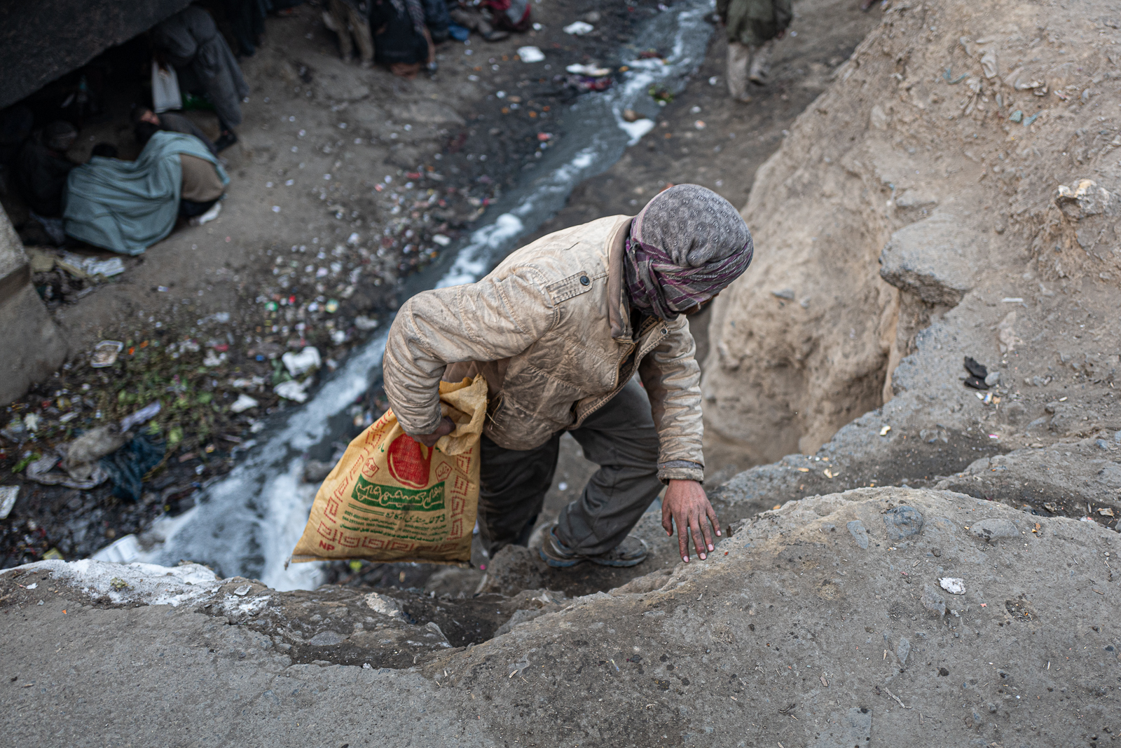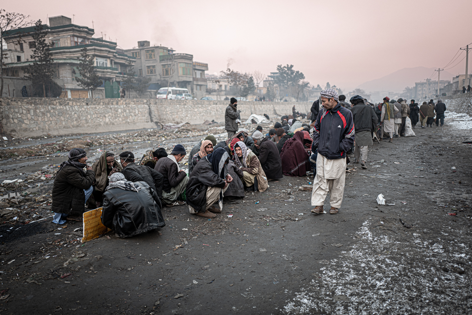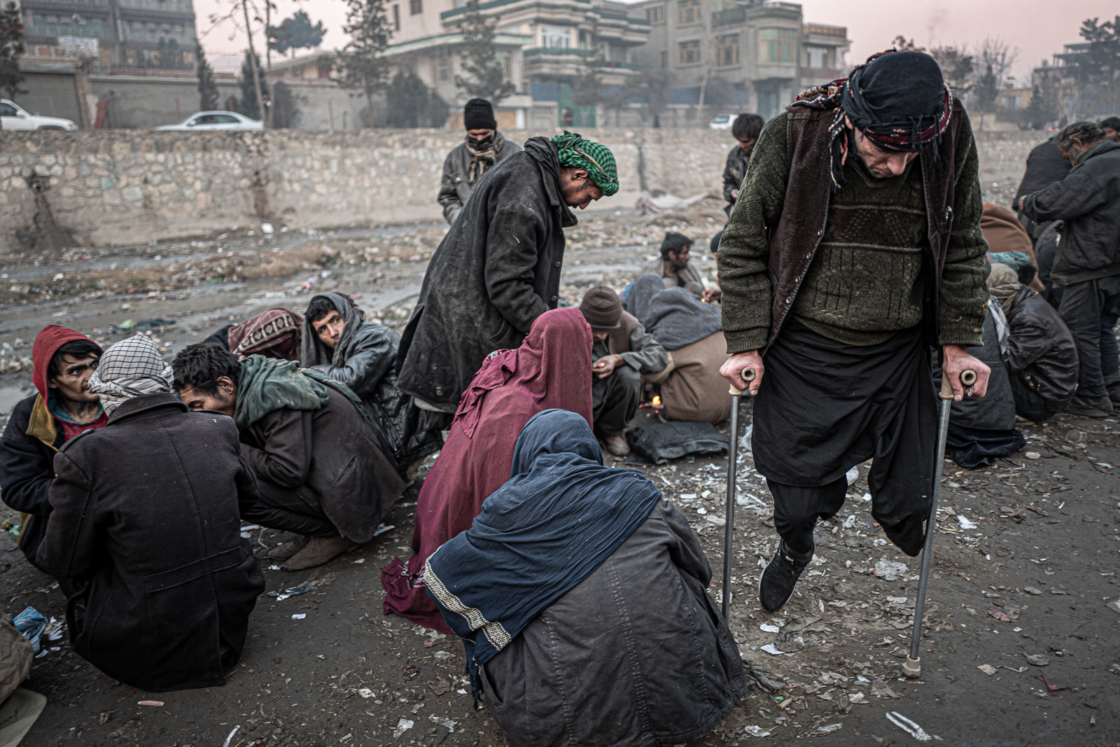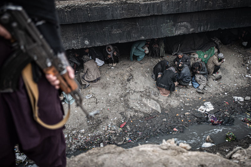 Sukhta means "burning". The scenery is absurd. The bridge is bustling with activity. Market stalls, market criers, fruit, vegetables, chickens. By Kabul standards, life is flourishing. Under the bridge, small groups of neglected men with sallow faces and lifeless eyes. They are as dirty as the ground on which they sit or lie. Some of them are completely unabashedly taking a shot as I walk past them. I am accompanied by two armed Taliban who are visibly tense. Many of the addicts are armed. And depending on what drug they are on - opium, heroin, Christal or hashish - the situation can escalate abruptly. My discomfort increases the deeper we go into this drug jungle. A sickening melange of smoke and excrement is omnipresent.