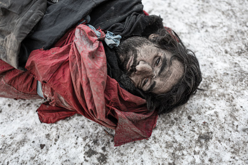 Milky dead eyes stare at me from a pale and sunken face. The dull hair is full of dirt, his beard amazingly well trimmed. The body is wrapped in a thin red blanket. It is cold at the almost dried riverbed, the temperatures drop below minus 10 degrees during the night. Presumably, the man fell asleep while intoxicated.