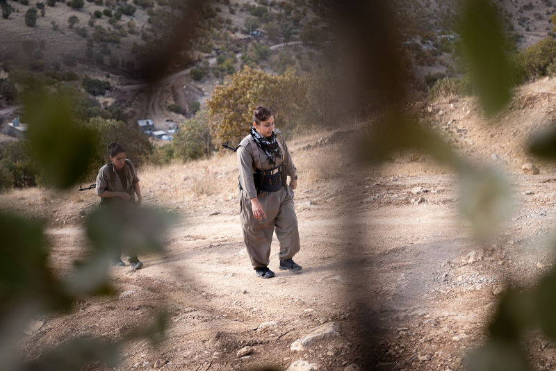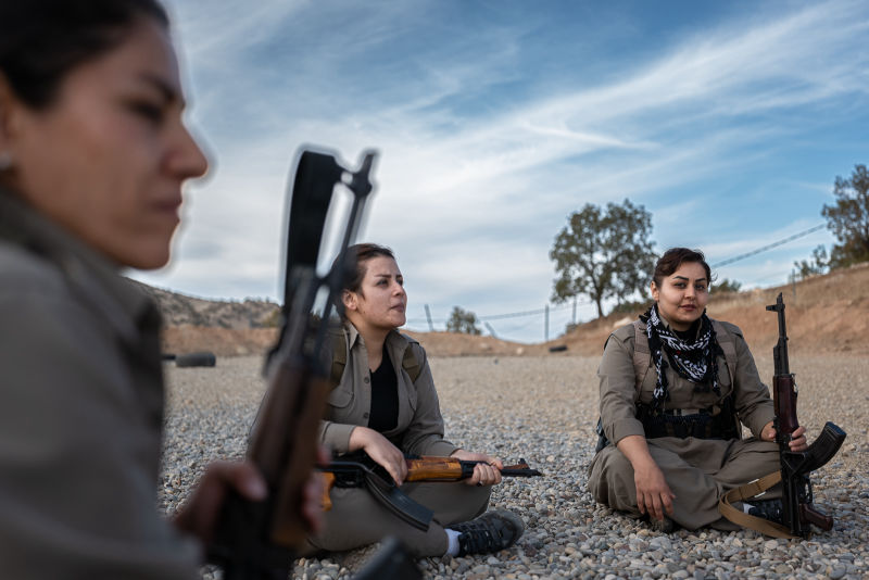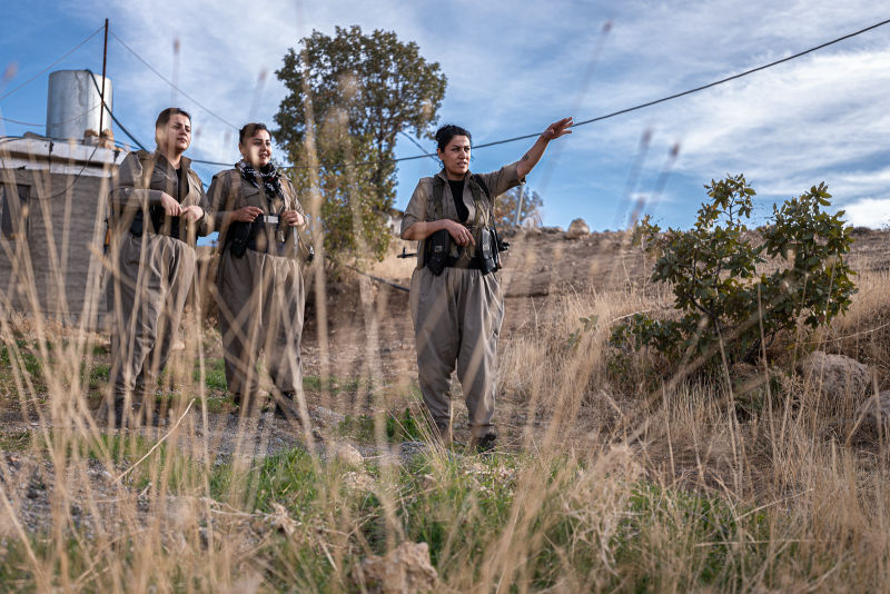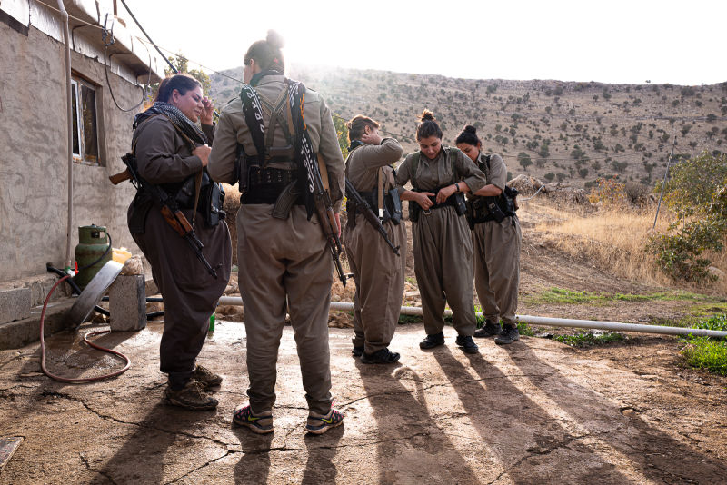 So, throughout the next hours and days, I always came back to chatting with the commander of the girls. Bahar, 42 years old, made of tendons, ligaments, muscle, skin and tattoos. Clearly, a no-nonsense person who will be at ease breaking your nose or ripping you apart in case you're up to some bullshit. Being a Pesh' since 2018, she features a high level of discipline and ethics, was promoted to become a group leader for recruits, teaching them in party doctrine, military tactics, ethics and philosophy of life. However, she does not want to talk about her past.
