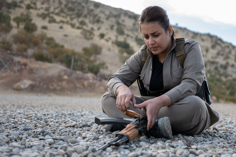 On the next day, I am joining the brigades medic who conducts basic medical training with the recruits. One of them is Kimiya. It is easy to tell that she is one of the "fresh" recruits. Properly dressed and combed hair, carefully applied lipstick - telltale signs that a young woman is, well, a young woman. Being a Peshmerga In the rough and unforgiving mountains, however, will ultimately refine her focus of daily body care.